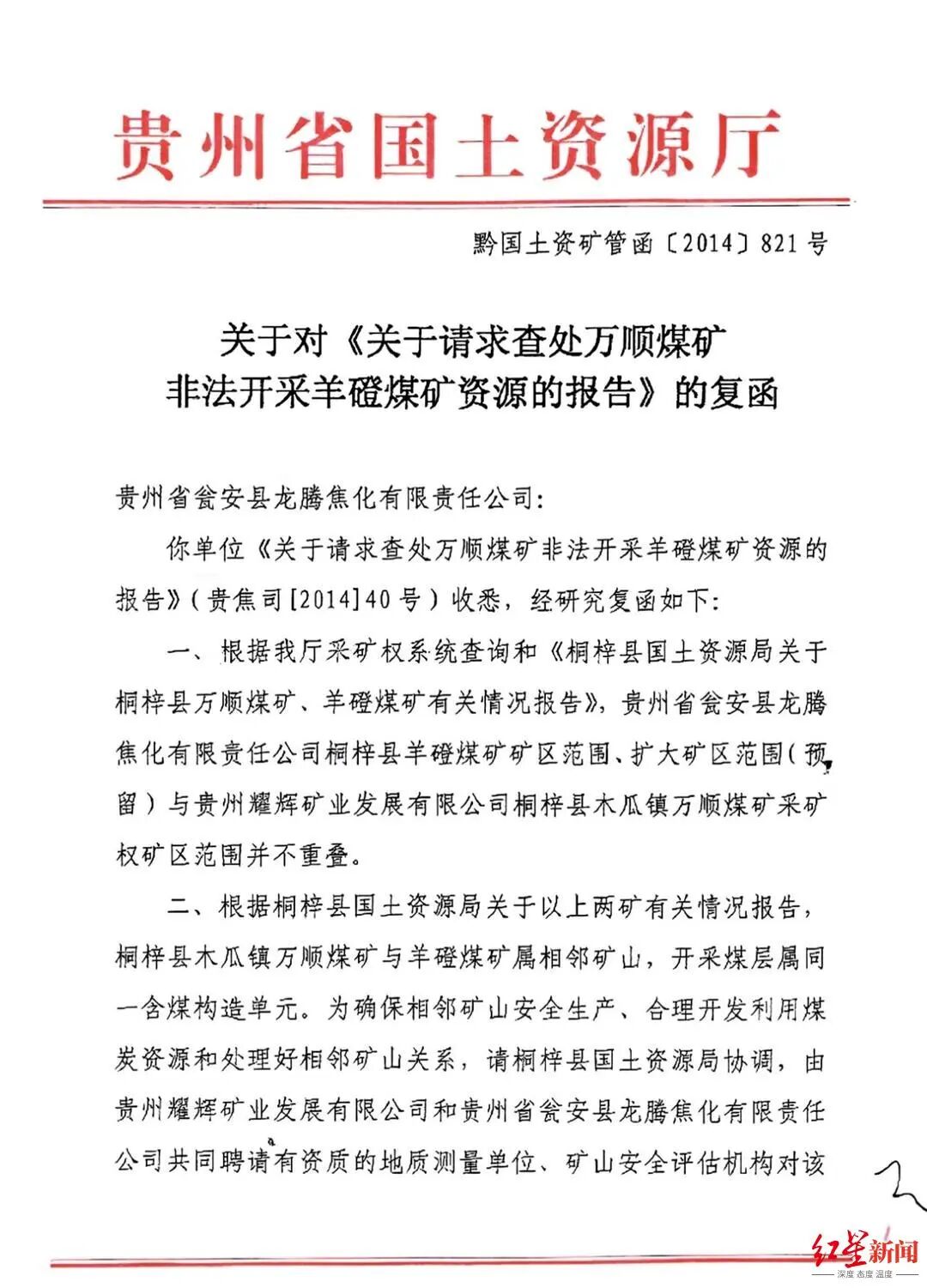 ▲贵州省国土资源厅2014年针对万顺煤矿被举报非法开采的复函
