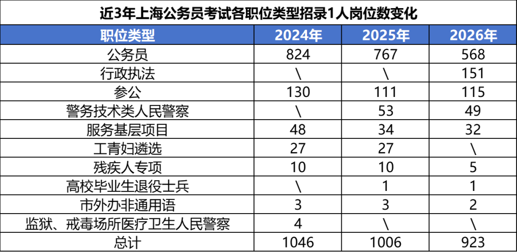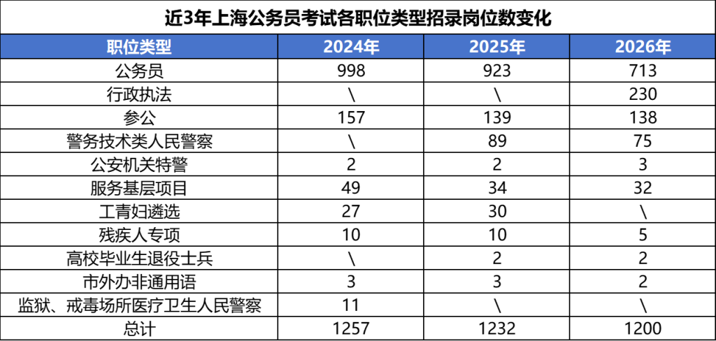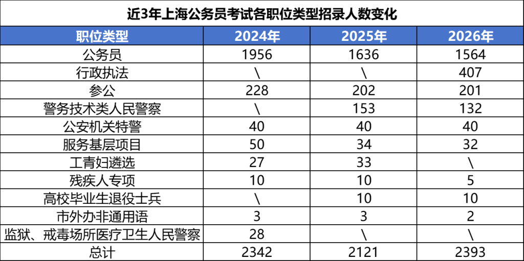 围绕上海经济建设高质量发展和构建高素质专业化公务员队伍的实际需求,2026年上海公务员招录职位细分为“综合”、“政法”、“数字信息”、“财经”、“城市建设”、“卫生健康”、“公安司法机关基层人民警察”、“行政执法”等8个专业类别,将行政执法类公务员招录统一纳入本次公务员考试。
