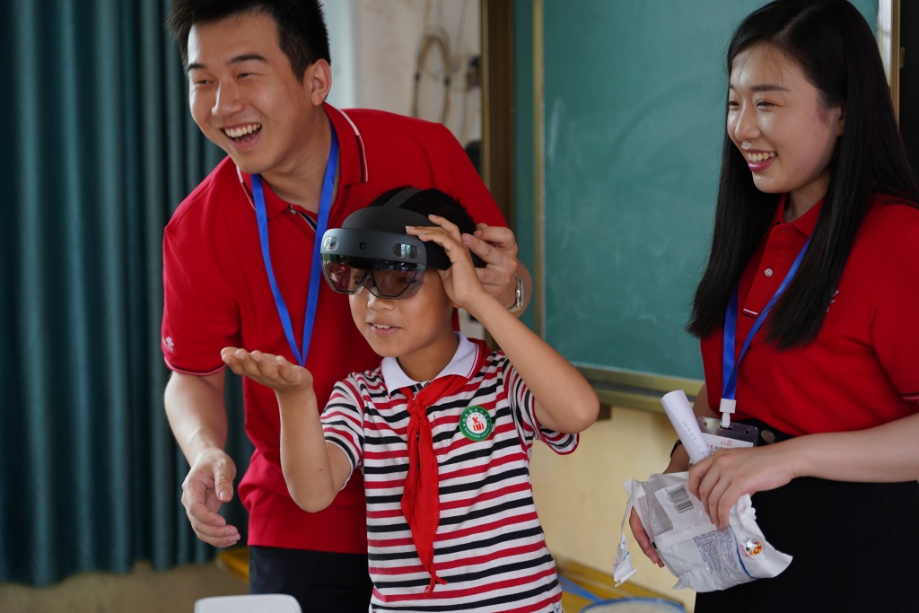2021年江西赣州段屋乡康梁小学,上海联通志愿者郎紫茹、刘佳豪带领小朋友体验VR眼镜等智能设备