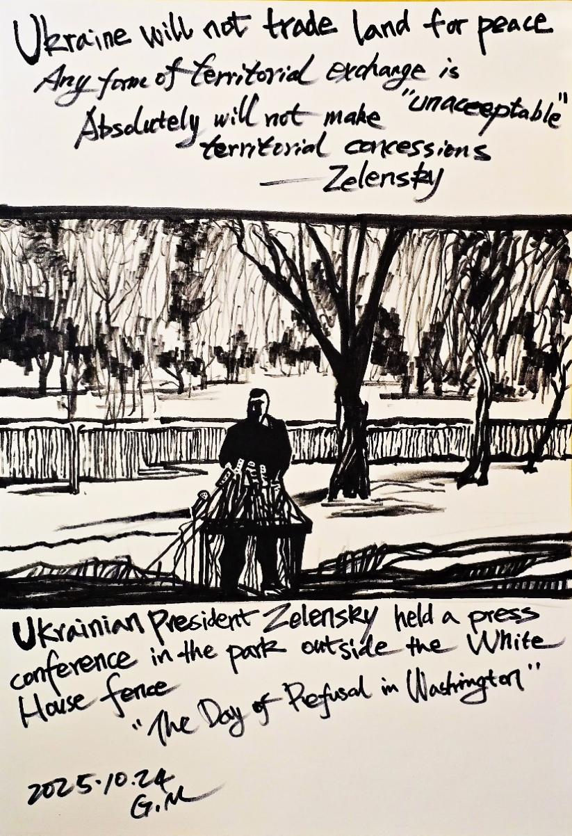 图2 乌克兰总统泽连斯基一再表示:乌克兰不会以土地换和平 纸本水墨 65cm X 45cm李公明 作 2025年10月24日