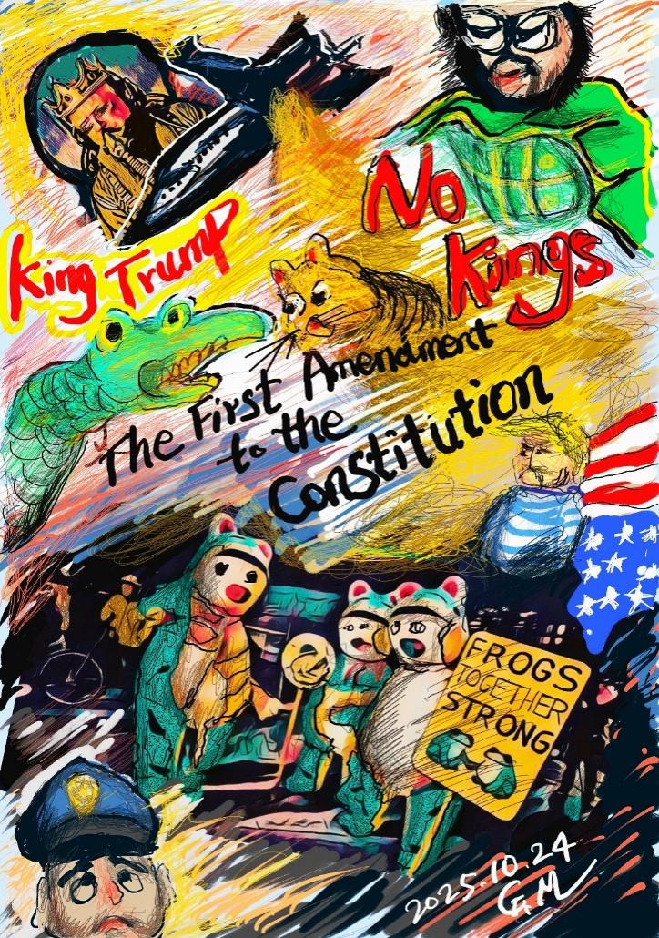 图1 “不要国王!”全美700万人上街抗议,特朗普用AI视频泼粪回击 李公明作 手机手绘 2025年10月24日