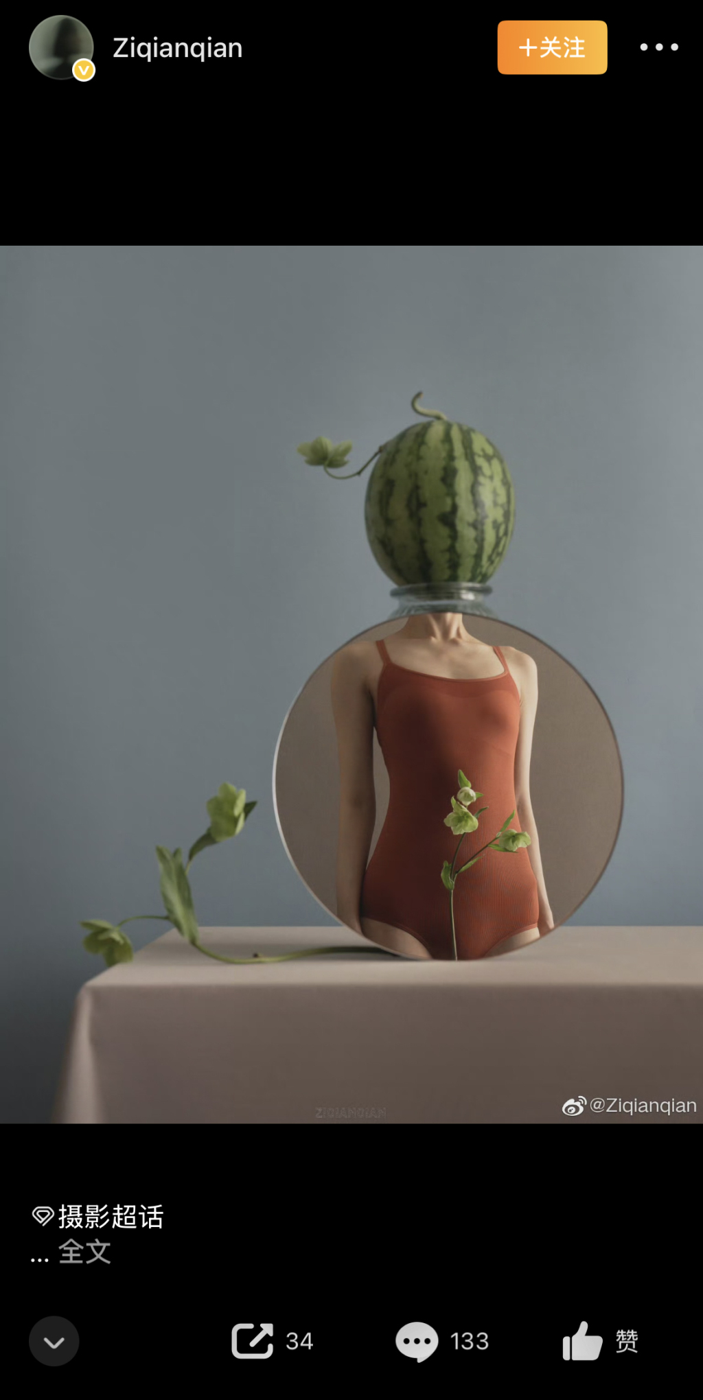 对于Yannick俞跃提到的创意抄袭。记者看到,摄影师 Ziqianqian 于2020年开始拍摄的系列有百余张,使用了镜子、花朵、台面与身体局部作为画面元素,这些元素与被质疑的两个系列作品中的照片元素比较吻合,皆通过现实与镜子反射出的其他空间构建画面,被质疑的两个系列照片与 Ziqianqian 的作品细节不一样,但概念雷同。