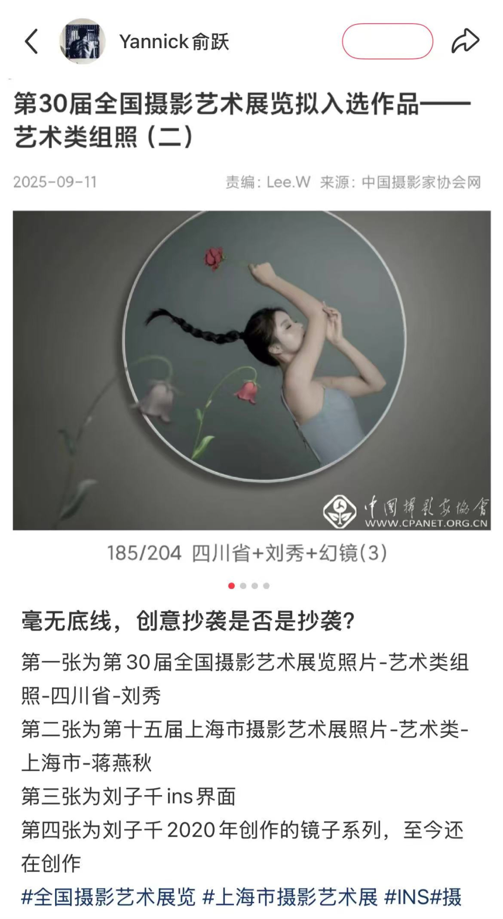 本月11日,名为Yannick俞跃的网友在网络上发帖,质疑入展“第15届上海市摄影艺术展”的照片系列《无相》与入选“第30届全国摄影艺术展览”(下称“国展”)的照片系列《幻镜》相同,两者均和网络上的另一位摄影师Ziqianqian的照片雷同,存在创意抄袭。Yannick俞跃发帖时,“国展”正处于9月11日至9月17日的公示期内,社会各界均可对评审结果进行监督。而“第15届上海市摄影艺术展”则已过公示。