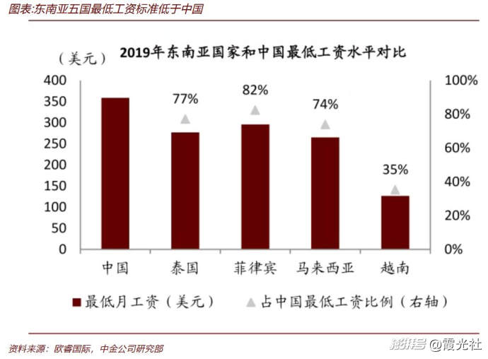 中金公司研报指出,中国劳动力每周工作时间为46小时,而泰国的周工作时间为45小时,与中国相当。根据欧睿国际数据,2019年,泰国最低月工资标准约为中国的77%。加上整体的劳动力素质较高,且具备一定英语能力,因此对外资企业投资设厂有较大的吸引力。