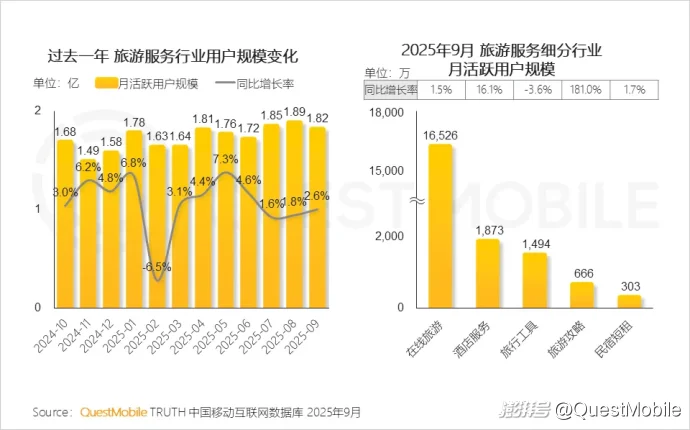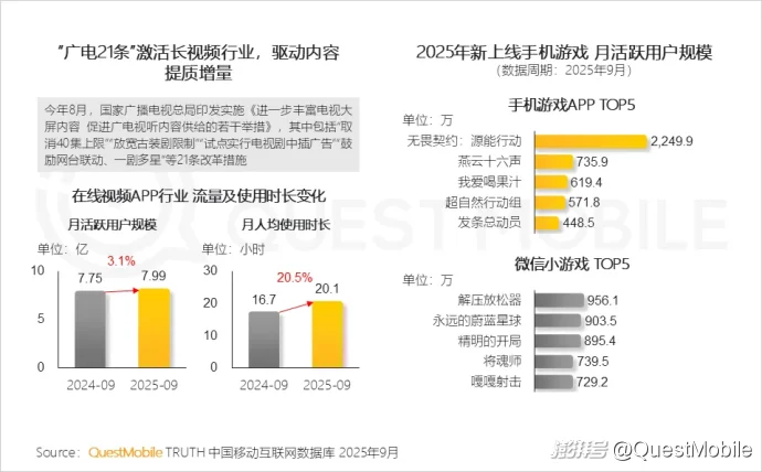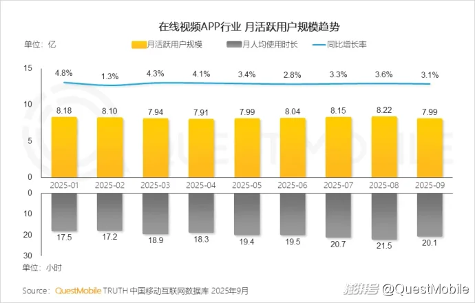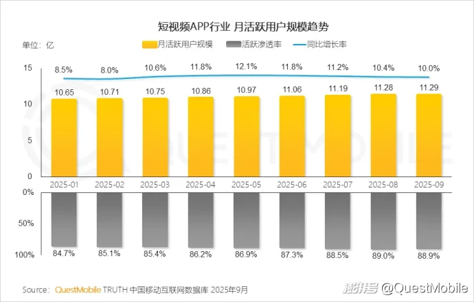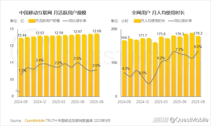 QuestMobile数据显示,2025年9月,全网用户规模达到12.69亿,月人均使用时长达178.2小时,同比增长8.2%。