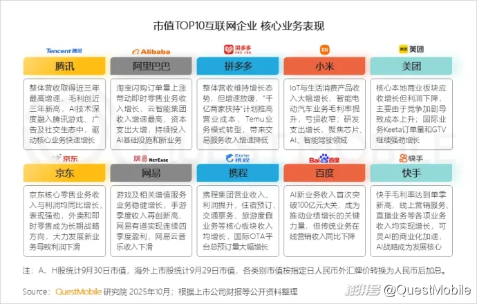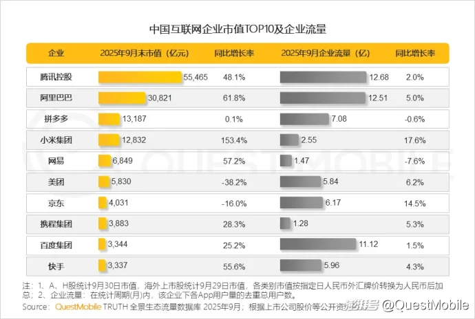 1.2 2025年9月末腾讯控股市值重回5.5万亿元,小米、阿里巴巴、网易和快手展现出强劲的市值增长动能;企业流量方面,腾讯、阿里巴巴、百度稳居流量第一梯队,小米、京东、美团为增速TOP3