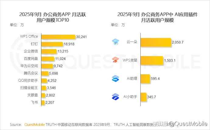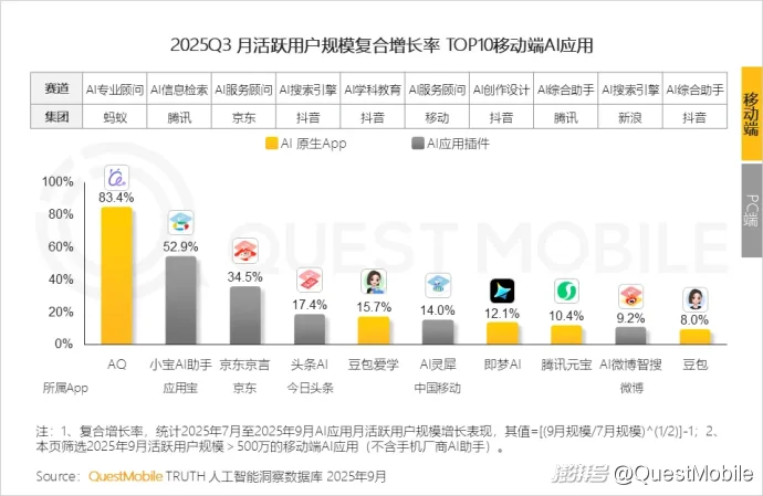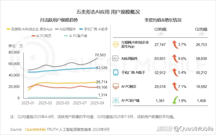 QuestMobile数据显示,2025Q3,AI应用插件月均活跃用户规模6.39亿,相较Q2增长9.0%。