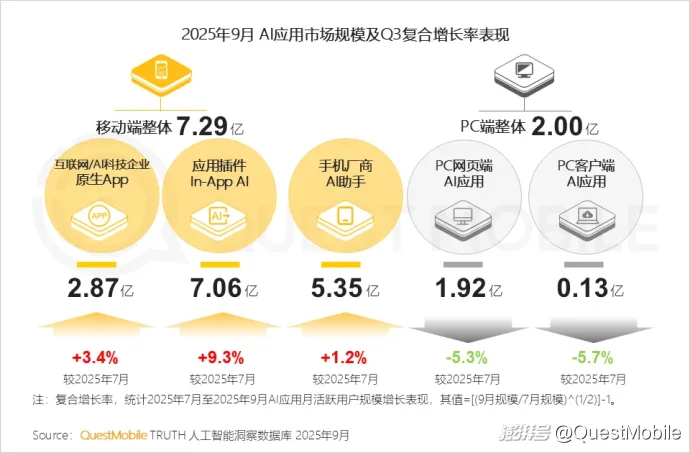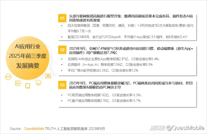 QuestMobile数据显示,2025年9月,移动端AI应用整体用户规模占全网(移动端)57.4%;原生App、In-App AI及手机厂商AI助手,用户规模分别达2.87亿、7.06亿和5.35亿。