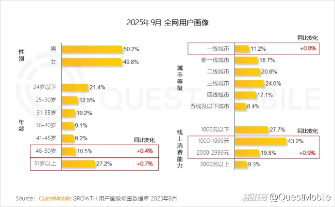 首先,用户结构持续向更健康的态势前行。截止到2025年9月,一线城市用户占比达到11.2%,同比增加了0.8%;线上消费能力在1000元-2999元区间的用户占比63%,同比增加了0.9%。这延续了年初以来大城市、中高消费力用户稳步增长的态势,也意味着这个趋势并非昙花一现,而是充满韧劲!