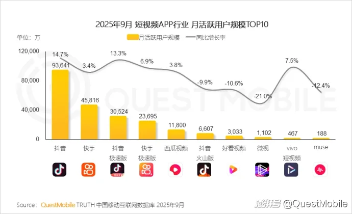 Ⅱ. 抖音持续领跑,快手稳居第二,行业呈现“头部集中、中尾部承压”格局
