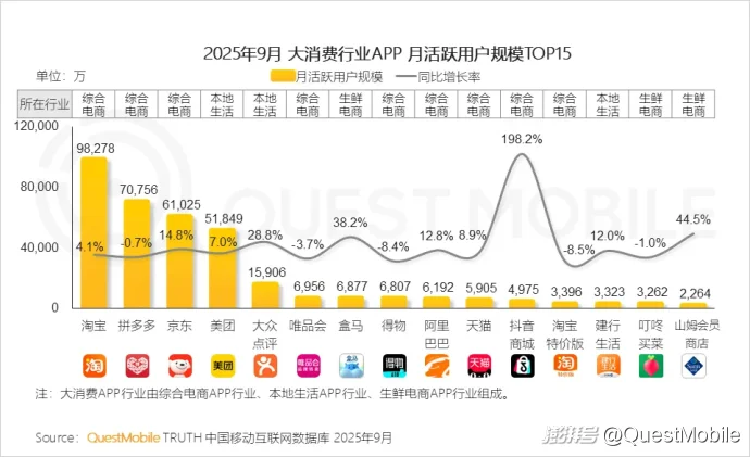 大消费行业TOP15 APP中,典型综合电商平台,如淘宝、京东通过业务扩展,巩固流量优势,抖音商城以内容驱动实现用户规模同比增幅198.2%;同时,本地生活与生鲜电商则借助优惠活动,实现用户规模普遍增长