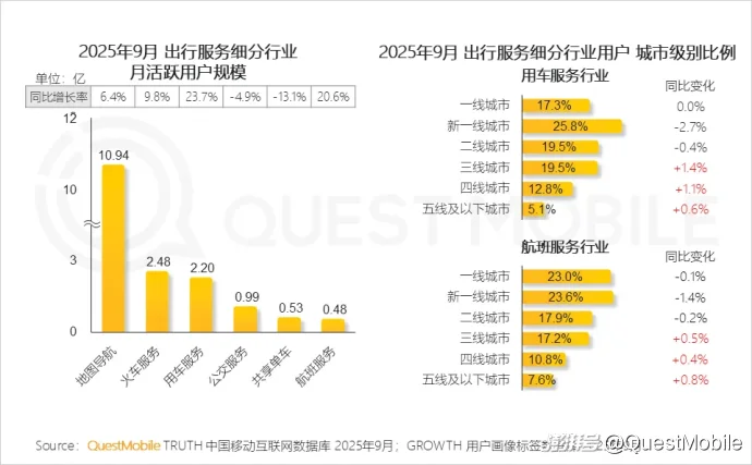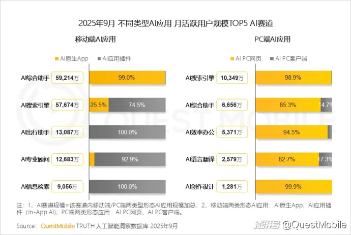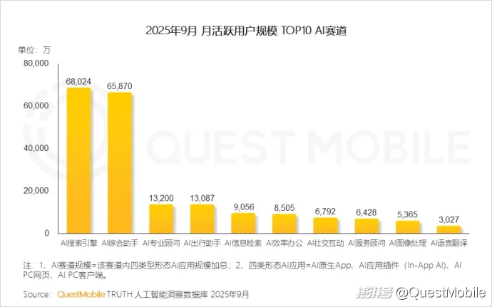 QuestMobile数据显示,2025年9月,AI搜索及AI综合助手赛道规模分别为6.8亿和6.6亿。