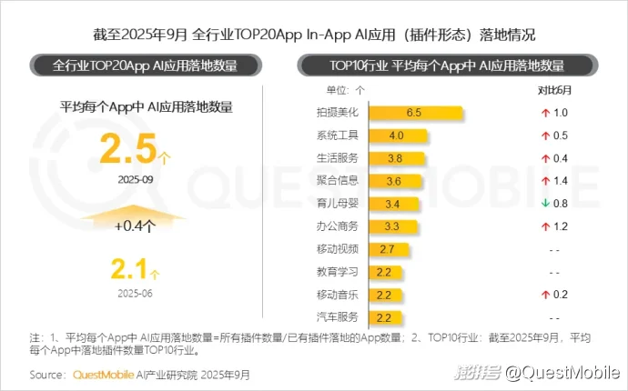 QuestMobile数据显示,25个互联网行业TOP20 App中,平均每个App内有2.5个AI应用落地,较上季度增加0.4个。