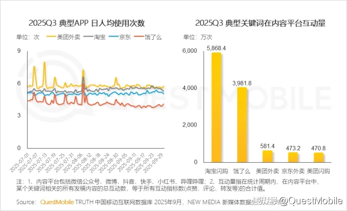 Ⅳ. 即时零售业务竞争白热化,“闪购”引爆社交互动量,线上消费生态呈现美团外卖高频刚需、淘宝闪购声量夺人特征