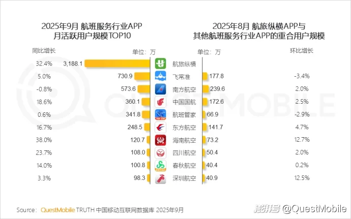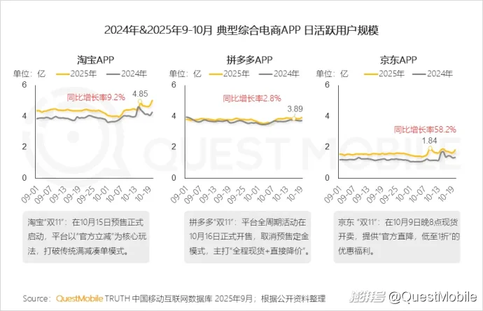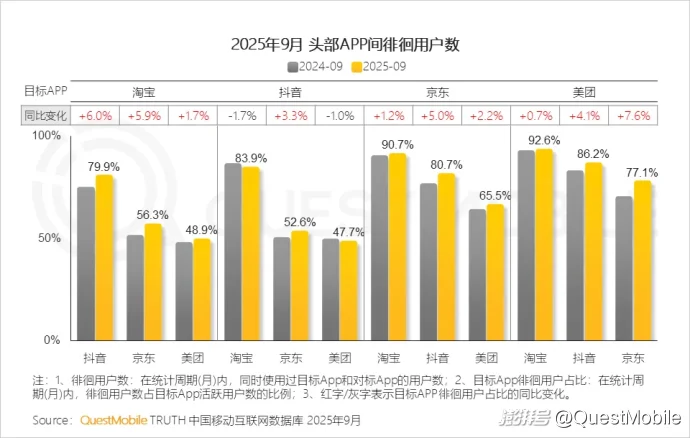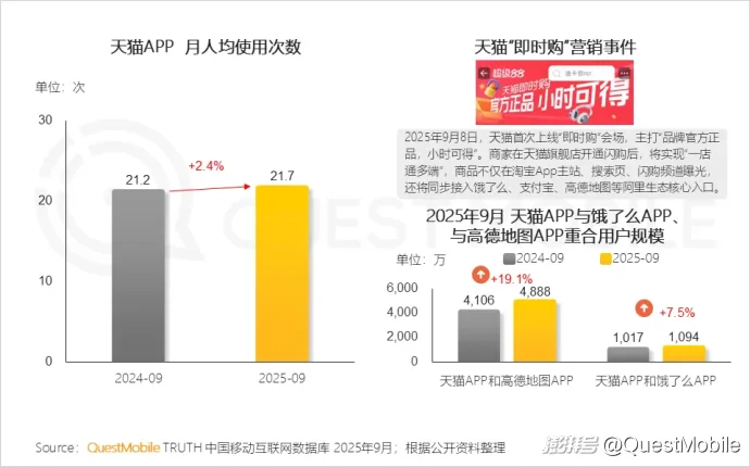 QuestMobile数据显示,2025年9月,天猫APP月人均使用次数同比增长2.4%,达21.7次。天猫上线“即时购”业务,天猫APP、饿了么APP、高德地图APP内部互联互通,重合用户规模同比均增长。