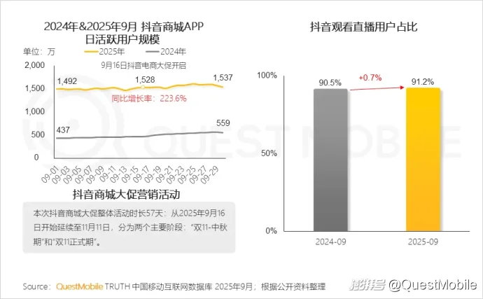 Ⅰ. 抖音商城借“中秋+双11”连卖活动抢占大促先机,9月16日大促首日吸引1528万流量,同比增速达223.6%;同时,用户对“内容+货架”模式的持续青睐,本月观看抖音直播比例也有所增长