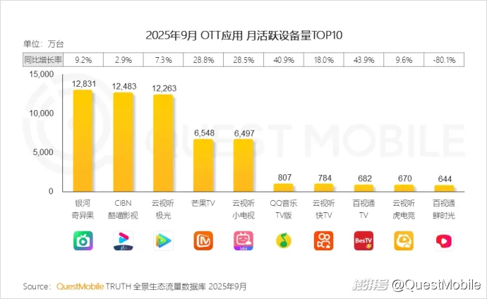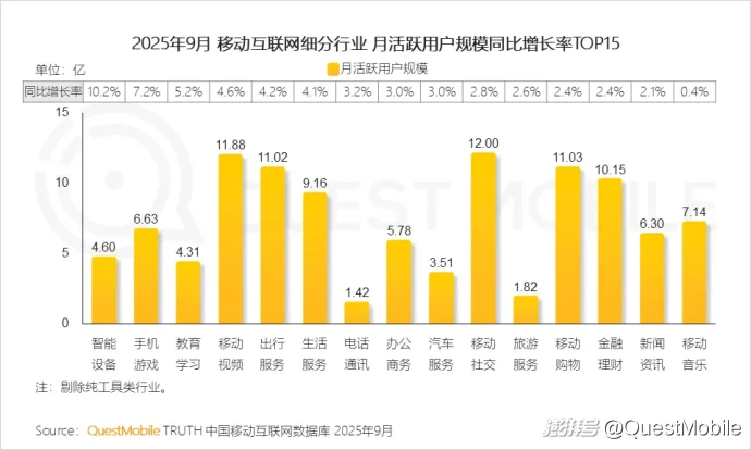 QuestMobile数据显示,2025年9月,智能设备、手机游戏、教育学习为流量增速TOP3行业,月活跃用户规模增至4.6亿、6.6亿、4.3亿,同比增长率分别为10.2%、7.2%、5.2%。