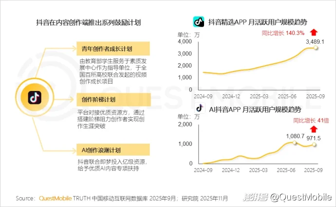 QuestMobile数据显示,截止2025年9月,抖音旗下主打优质中长视频内容的抖音精选APP月活跃用户规模近3500万,同比增长140.3%,“AI搜索+短视频”的AI抖音APP月活跃用户规模峰值突破千万,9月同比增长41倍。