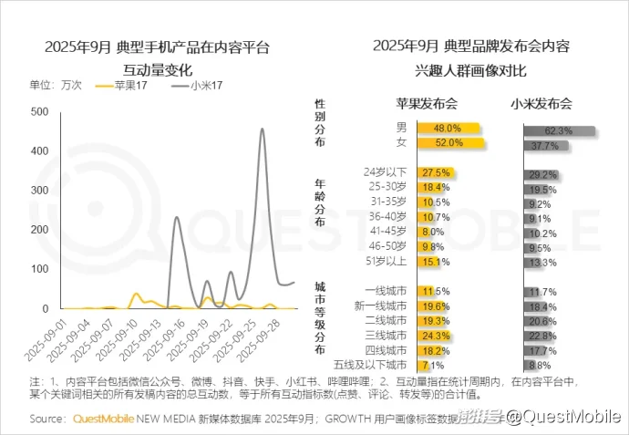 从发布会受众画像上看,小米发布会男性兴趣用户显著,且在24岁以下人群的渗透略高于苹果。