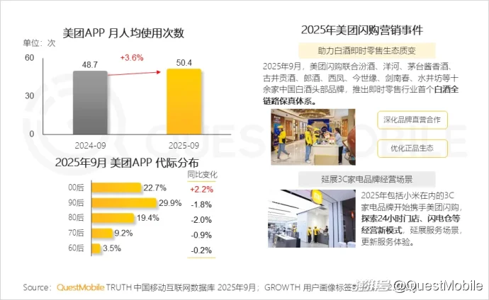 QuestMobile数据显示,2025年9月美团APP中,00后用户占比达22.7%,同比小幅增长2.2%。