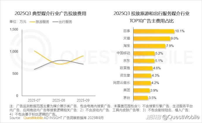 QuestMobile数据显示,互联网平台是广告投放核心参与者(如天猫、淘宝、京东、美团等),同时,典型消费品牌也集中于旅游行业投放,深度绑定合作,场景营销价值凸显。