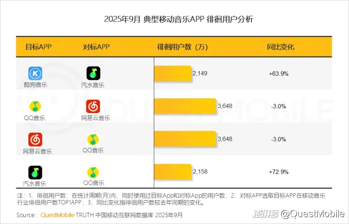 QuestMobile数据显示,汽水音乐与酷狗音乐、QQ音乐徘徊用户数分别达到2149万、2158万,且同比分别大幅提升63.9%和72.9%,市场竞争格局加剧;QQ音乐与网易云音乐互为最大的徘徊用户来源,且同比小幅下降3%,用户在两平台间双向流动达到暂时动态平衡点。