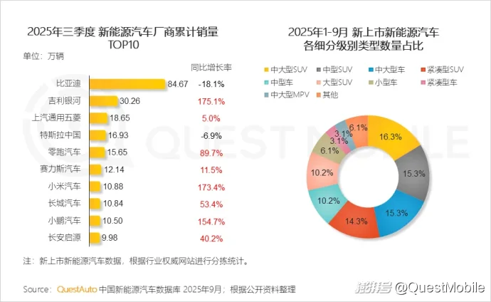 1.13 【新能源汽车】三季度吉利银河、小米汽车、小鹏汽车销量实现高速增长,2025年新上市汽车中,中大型SUV、中型SUV和中大型车三者合计占比接近50%,车企集中布局大空间、高性能、高品质车型