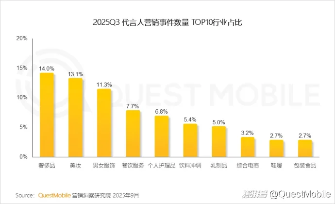 时尚产业是当前代言人营销的主力,核心目标为构建品牌形象与身份认同,奢侈品、美妆、男女服饰三大品类合计占比近四成;而综合电商平台也通过代言人合作,抢夺用户心智入口。