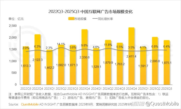 QuestMobile数据显示,2025年第三季度互联网广告市场规模达1875.1亿元,同比增长6.4%。