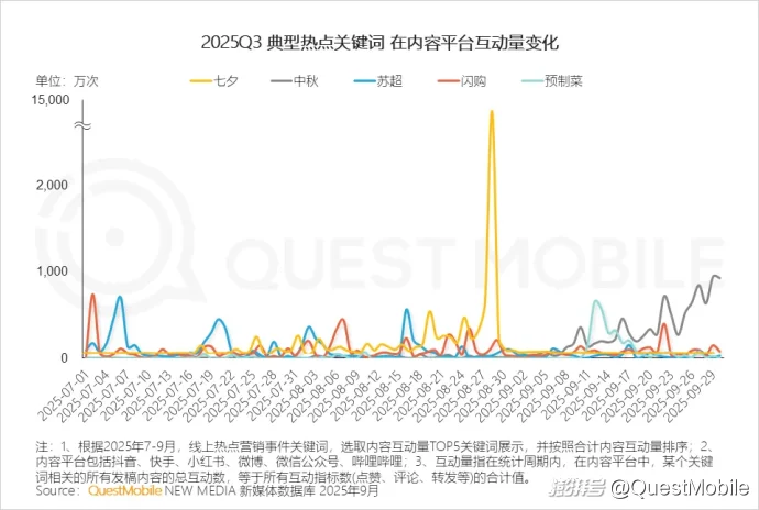Ⅱ. 从用户关注度上观察,七夕节点达社交营销峰值,是重要的社交和情感营销载体,中秋营销侧重礼品和家庭消费主场,进入9月稳步爬升;圈层热点及社会话题交替贯穿整季热点
