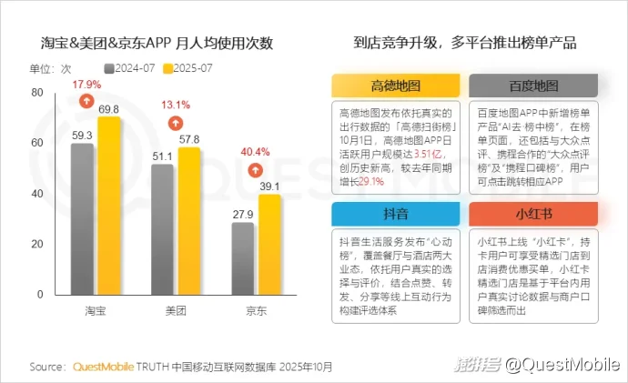 1.11 【本地生活】7月外卖补贴加码,带动淘宝、美团、京东APP用户使用次数同比大幅提升;到店业务开启“榜单之争”,高德地图、抖音等平台正通过构建更真实的消费决策指南,争夺入口