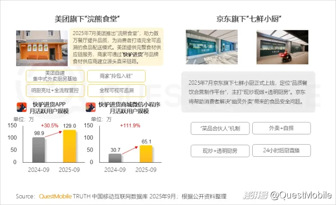 美团推出“浣熊食堂”,打破“一店一单”的传统限制,以实现跨品牌点餐,QuestMobile数据显示,美团旗下全品类餐饮供应链服务平台—快驴进货,其APP和微信小程序端流量同比均增长,分别为30.5%、111.9%;京东打造合营品质餐饮平台—七鲜小厨,以“外卖+自提”模式,打造完整的供应链闭环。