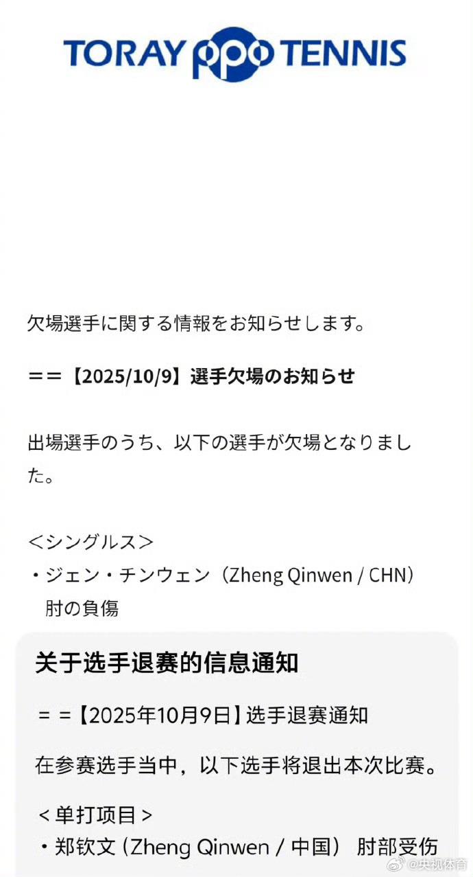 据官方消息,赛事卫冕冠军郑钦文因肘部受伤退出WTA500东京站。此前,郑钦文已经因伤退出了武汉赛和宁波赛。