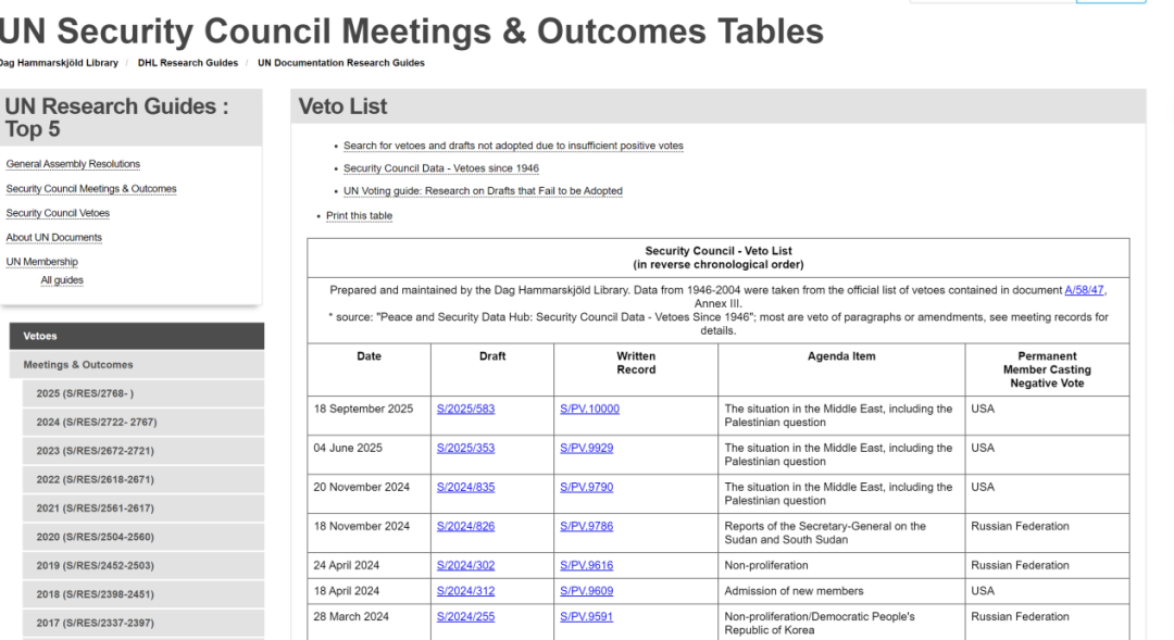 安理会表决结果记录未显示近一月有任何常任理事国使用过否决权。最近一次否决记录显示为2025年9月18日,美国针对当时由阿尔及利亚、丹麦、希腊、圭亚那、巴基斯坦、巴拿马、大韩民国、塞拉利昂、斯洛文尼亚和索马里等国提出的对巴以问题的决议草案使用了否决权。