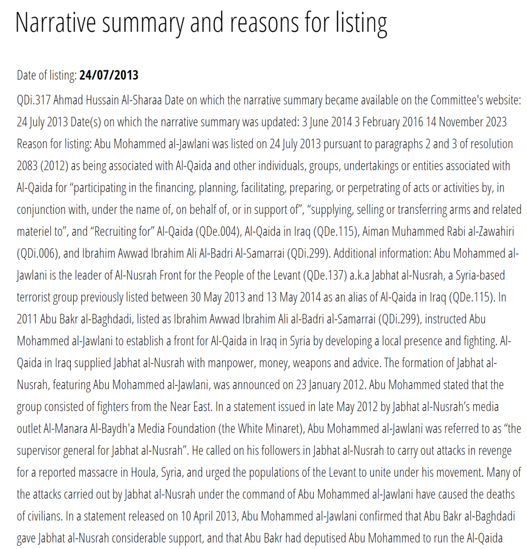 - 截至目前,沙拉(朱拉尼)及其领导的沙姆解放组织仍在联合国制裁名单上。