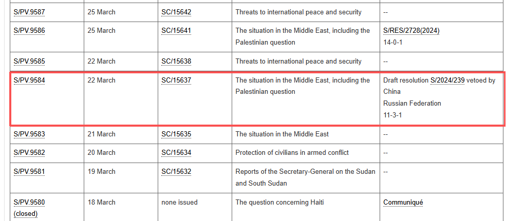 中国最近一次使用否决权的时间及相关事项(红框)截图。