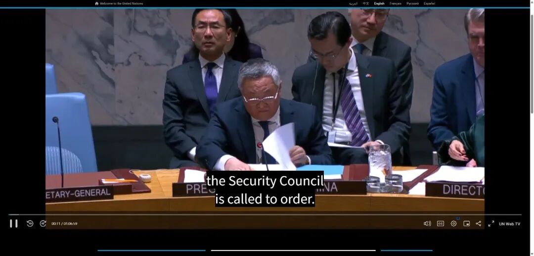 将网传视频画面与安理会会议存档视频进行比对,可以确认该视频画面出自今年2月24日安理会第9866次和第9867次会议。视频中傅聪的穿着、中方代表团人员配置及会场布置等细节与画面内容均吻合。而这两场会议的主题均为“维护乌克兰和平与安全”,其中未提到与叙利亚政权相关内容。