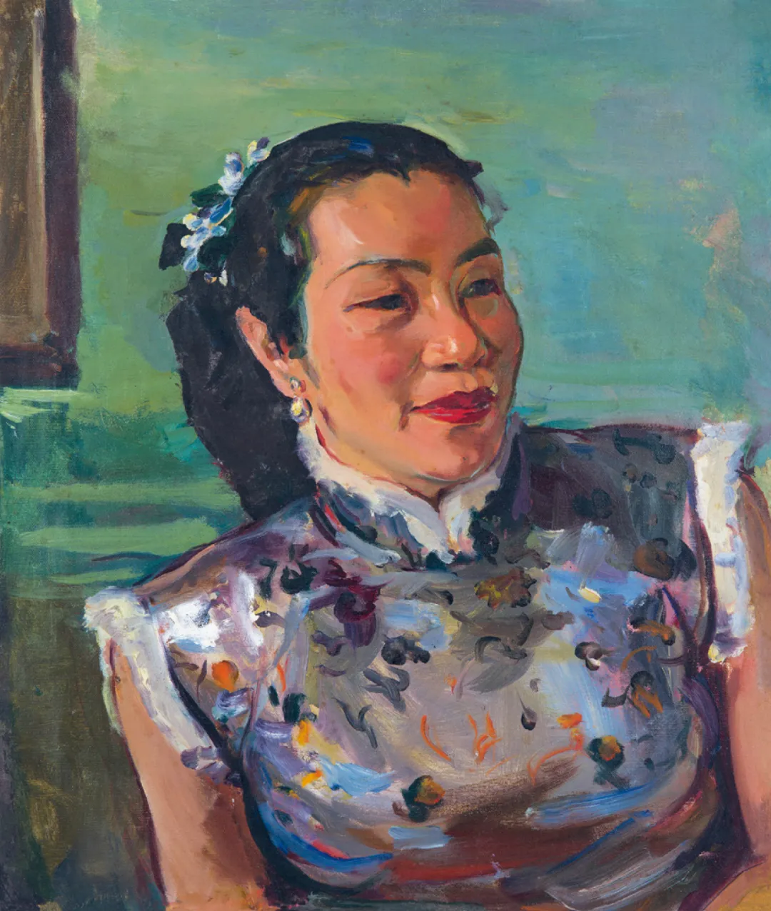画面中,冯伊湄着一袭花卉旗袍,神态闲雅,面带浅笑,姿态自然而安定。她的眼神中既透出温柔的亲密感,又保有一种自信与静谧。司徒乔以松动而厚实的笔触描绘服饰与背景,形成轻快的色彩氛围;而在面部细节上,则转向更细腻的描摹,使人物在写实与情感间保持平衡。作品既呈现了油画技法的自由挥洒,又传递出私人情感的含蓄流露。