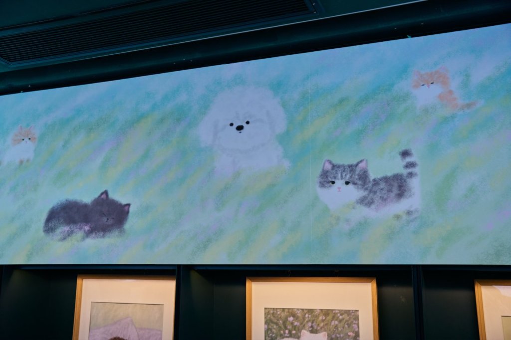 “最初遇见xuān的作品,是在一个慵懒的周日下午。当我像往常一样在小红书浏览艺术内容时,一组猫狗插画突然闯入视线——那幅作品,一只灰猫戴着蓝色的围脖,水汪汪的眼睛看着我。”策展人李京还记得被击中内心的那个瞬间。