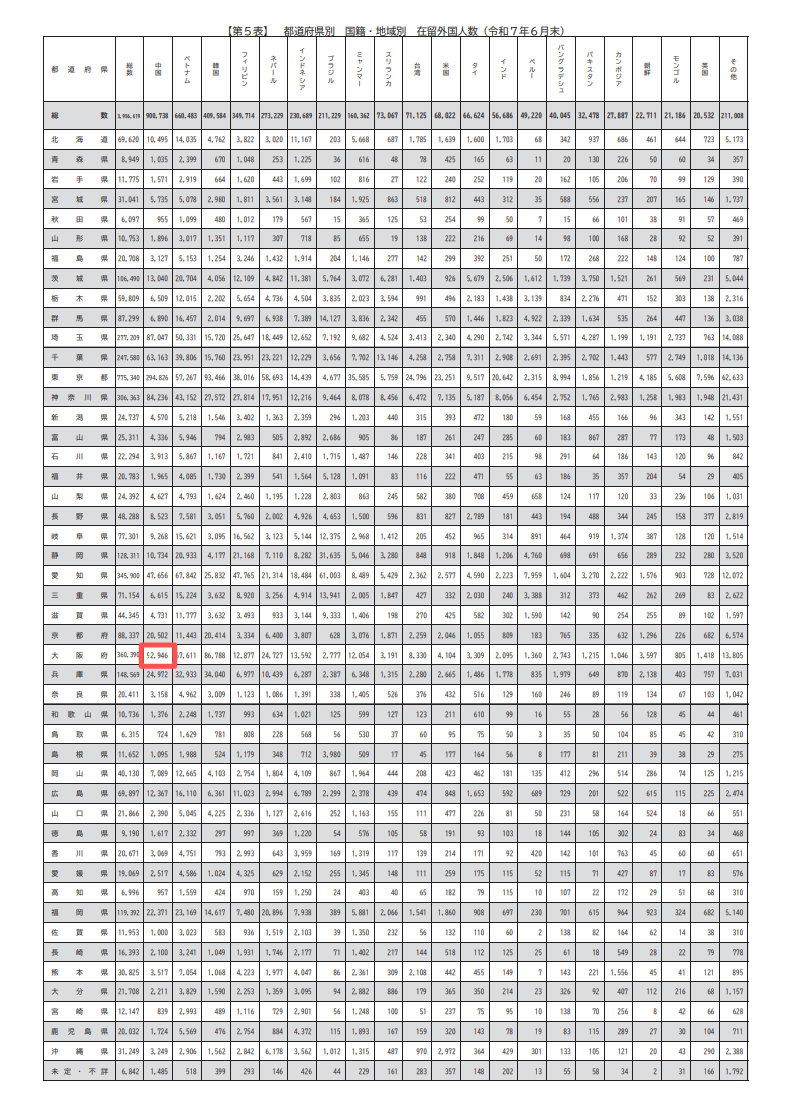 根据日本出入国在留管理厅的数据,截至2025年6月底,长期居住、持有合法在留资格的中国人在大阪共有92946人,而同期大阪府的总人数为8774930人。也就是说,居留在大阪府的中国人占总人口的约1.05%。
