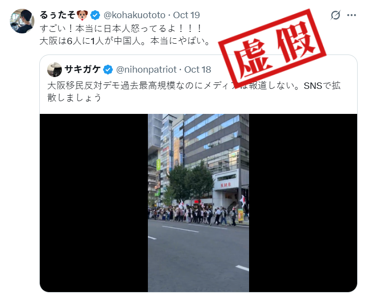 对网传视频截取关键帧并进行反搜发现,该视频最早由X平台用户在9月27日发布,配文为“大阪的反移民游行,人真是太多了”,并未提及“中国”,或“大阪六人中就有一人是中国人”的说法。