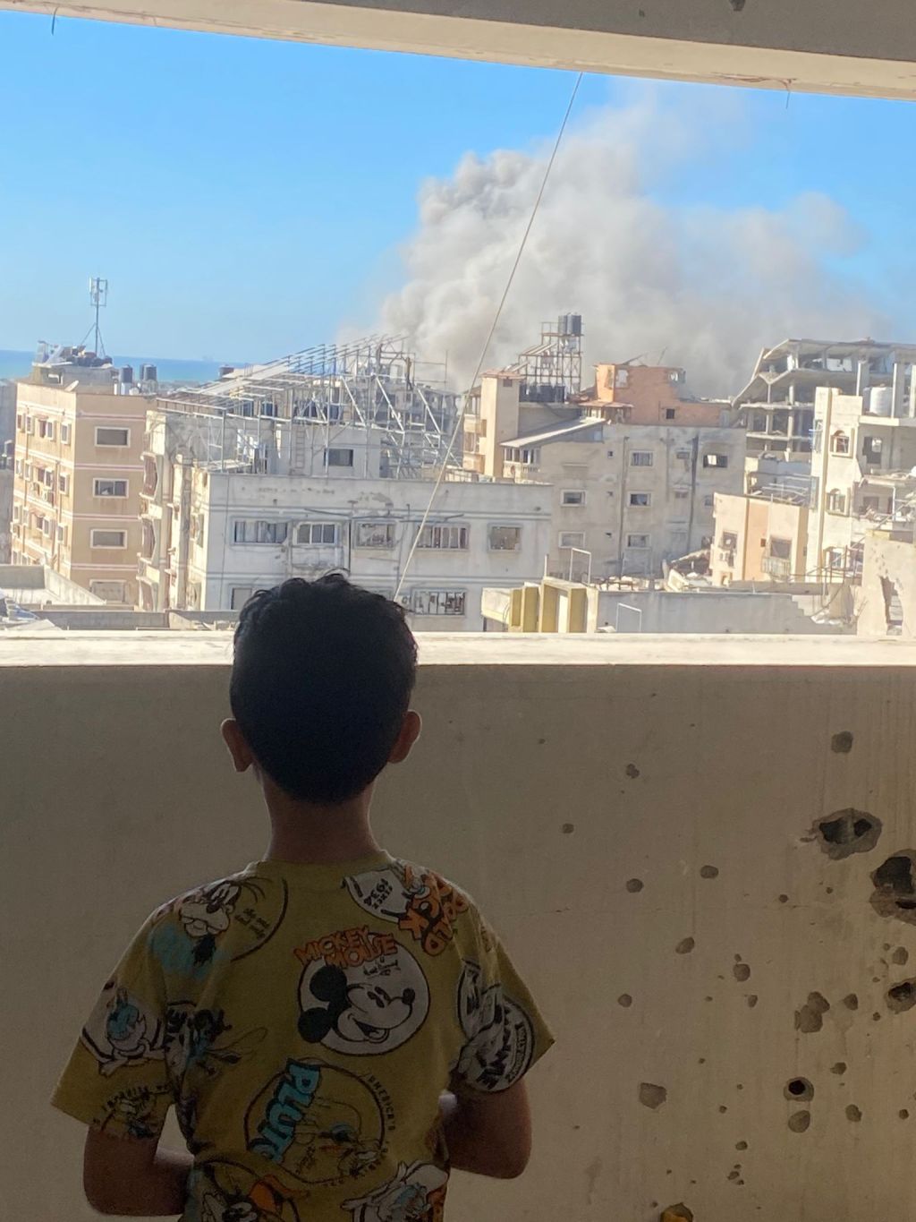 阿斯玛的孩子在看着家附近的大楼被炸毁。