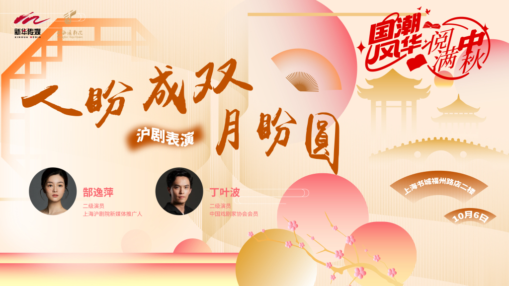 9月26日,上海评弹团优秀青年演员钱晏、姚依依、杜辰宗、梅梦荻等在1925书局带来“醉美人团圆:中秋评弹特辑”,预热双节假期的到来;10月2日,二级演员、上海越剧院越剧推广人沈馨文将做客上海书城五角场店,呈献“越音绕梁,今朝‘越’来圆”越剧经典戏专场演出;10月6日,二级演员、上海沪剧院新媒体推广人郜逸萍,二级演员、中国戏剧家协会会员丁叶波将来到上海书城福州路店,带来“人盼成双月盼圆”主题沪剧表演,以沪剧艺术的柔美唱腔演绎经典剧目中对爱情与团圆的深切期盼;10月7日,上海京剧院优秀老生演员曹晋老师将来到江南书局·书的庭院,为大家带来“赏花赏月赏国粹——生旦净丑度佳节”主题表演。