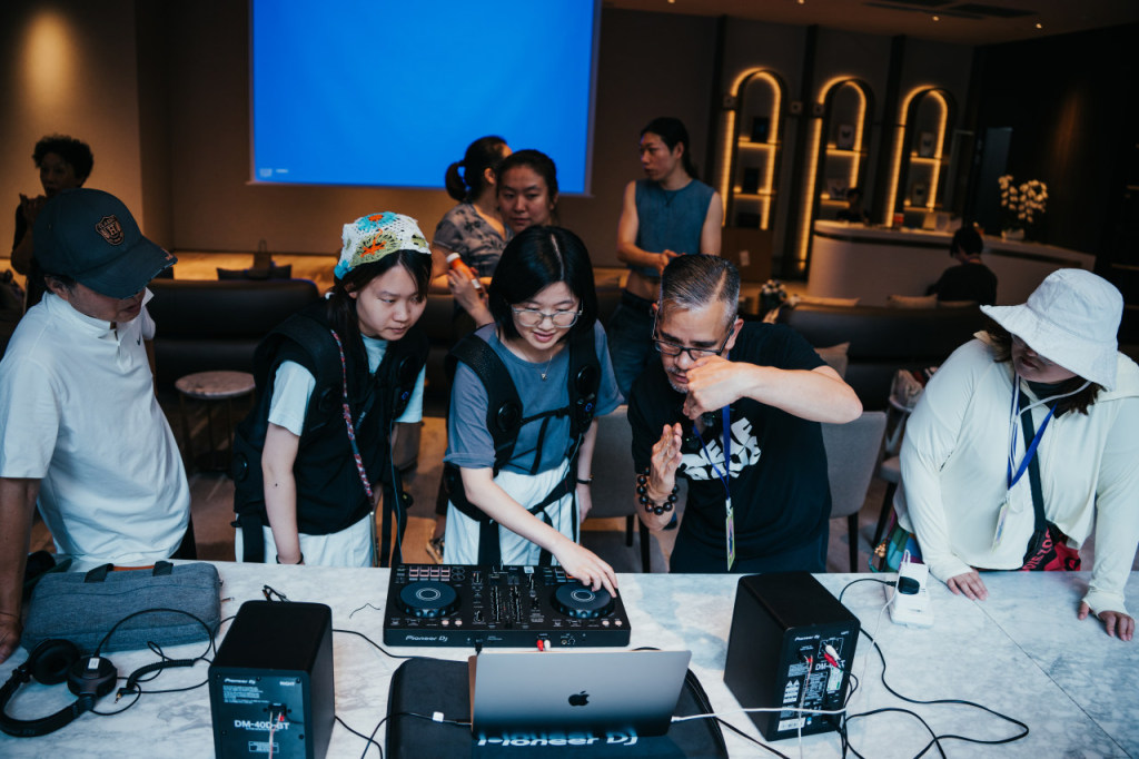 在工作坊中,DJ Troi Lee教聋人朋友如何通过特殊的震动背心,“听到”音乐。
