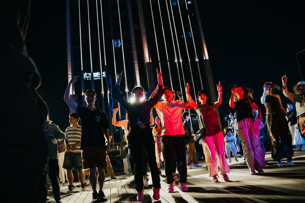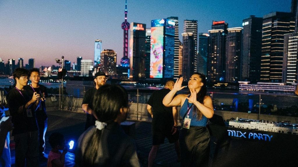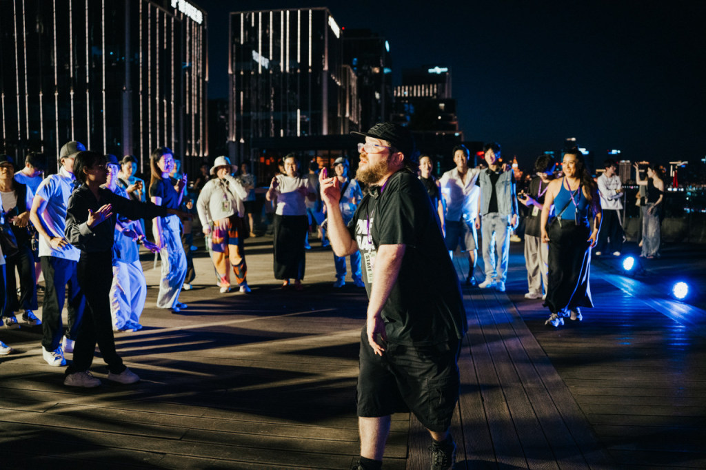 华灯初上,在外滩BFC的露天舞台上,三件套天际线如巨幅画卷铺展开来。舞台中央,来自英国的Deaf Rave团队DJ Troi Lee 正在打碟,灯光闪烁,地板震动,音乐震耳欲聋。
