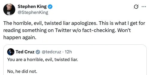 很快,斯蒂芬·金就删除了自己的跟帖,并发文表示歉意,甚至谦卑地承认自己就是“可怕的、邪恶的大骗子”。