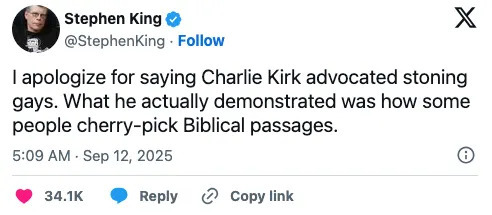 差不多就是在《死亡竞走》开始上映的时候,查理·柯克被刺身亡。一时之间,社交媒体上也围绕其言其行,展开激烈讨论。而斯蒂芬·金原本就是喜欢“上网冲浪”的老手。他在回复福斯新闻台主持人杰西·沃特斯(Jesse Watters)的帖文时写道:“他主张用石头砸死同性恋者。”就这么短短一句跟帖,立时引起风波。