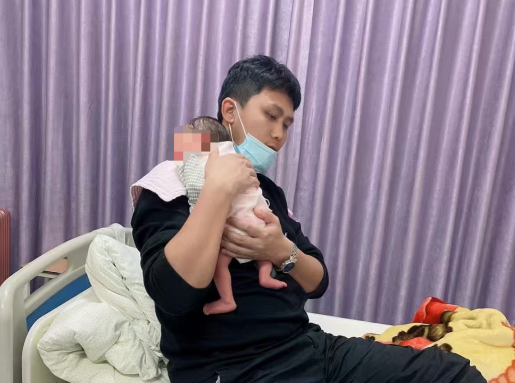 儿子刚出生不久,周宏勃抱着儿子。 受访者供图