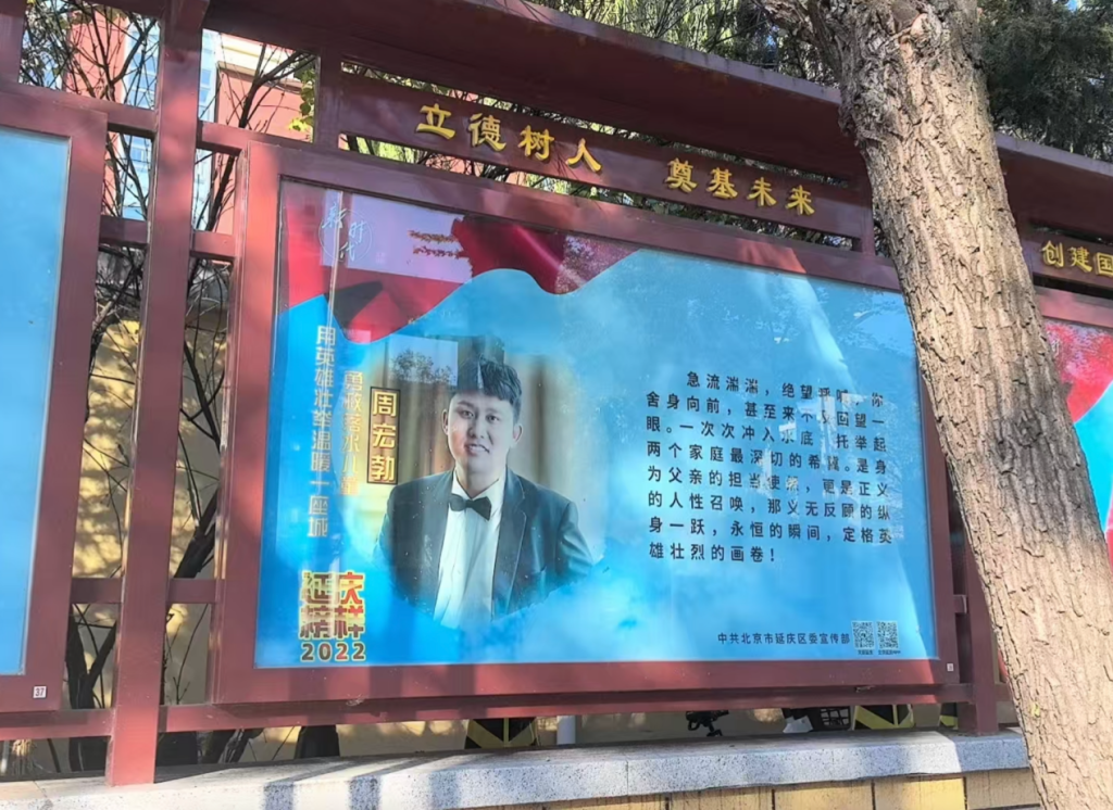 周宏勃去世后,对他的纪念被朴实、细微地呈现着。“我们家附近就是延庆一中,学校门口展示栏上就挂着他的照片,介绍着他的事迹。之前我没有发现那个照片,还是孩子告诉我那里有他爸爸。当时我不太相信,就想真的嘛,怎么会有呢,因为每次从那走都是骑电动车没注意,后面我骑电动车特意去看了一下。”看到丈夫的照片被挂在学校的外墙上供来往学生和市民瞻仰,唐莹心里很感动。