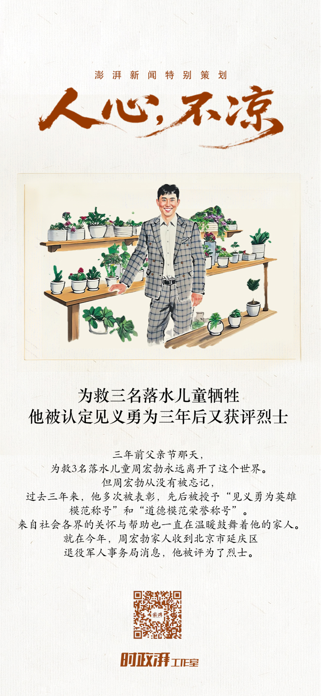 今天要讲的是英雄周宏勃的故事。2022年6月19日下午,为救3名落水儿童,周宏勃毅然跳入水中,后因体力不支溺水,永远离开了这个世界。但周宏勃从没有被忘记。三年来,他多次被表彰,先后被授予“见义勇为英雄模范称号”和“道德模范荣誉称号”。来自社会各界的关怀与帮助也一直在温暖鼓舞着他的家人。就在今年,周宏勃家人还收到北京市延庆区退役军人事务局通知,他被评为了烈士。